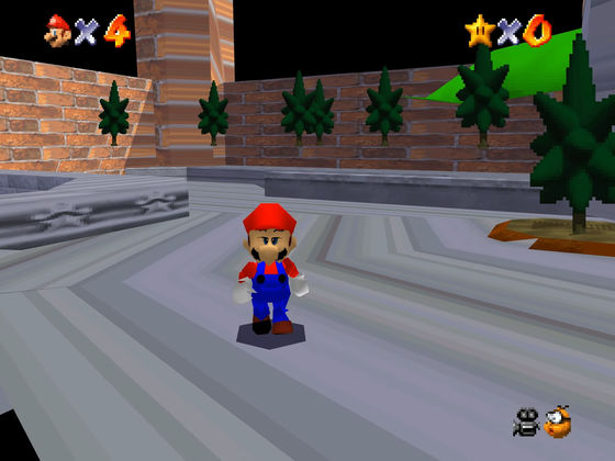 ゲーム画面はこんな感じで木がなぜか宙に浮いていたり、空が真っ黒だったりと、一部のオブジェクトが正確に描写できていないことがわかります。この通り、「Super Mario 64(DualShock Version)」にはまだまだ多くの制限があります。