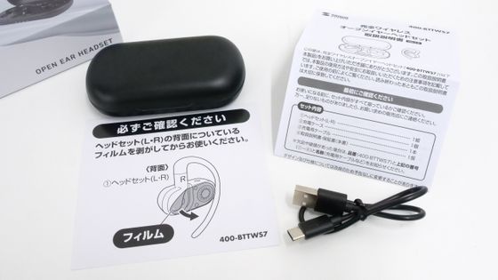 内容物は「400-BTTWS7」の充電ケースと本体、注意書き、取扱説明書、充電用USB Type-Cケーブルです。
