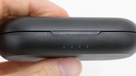 前面には開けるための溝と、充電量を示すためのLEDインジケーターが4個並んでいます。