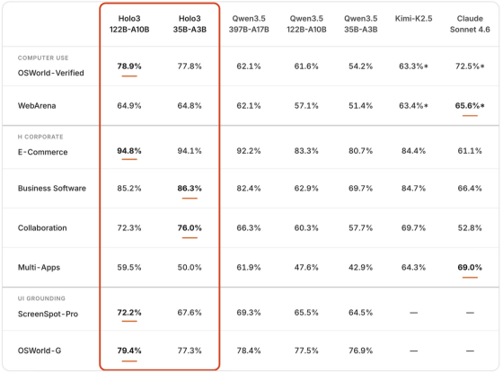 性能面ではオープンソース版のHolo3-35B-A3Bが国際標準ベンチマーク「OSWorld-Verified」で77.8%を記録しています。さらに、上位モデルのHolo3-122B-A10Bは同じベンチマークで78.85%を記録しています。なお、Holo3-122B-A10Bの総パラメーター数は1220億個で、動作時に使うアクティブパラメーター数は100億個です。