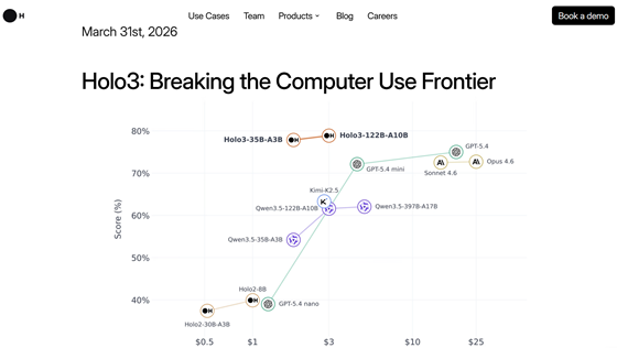 PCでクリック操作やタスク実行などができるAIモデル「Holo3」を、フランスのAIスタートアップであるH Companyが2026年3月31日に公開しました。Holo3はGUIエージェント向けに最適化された大規模ビジョン言語モデルで、オープンソース版の「Holo3-35B-A3B」はAIモデルの公開・配布サービスであるHugging Faceから無料で利用することができます。