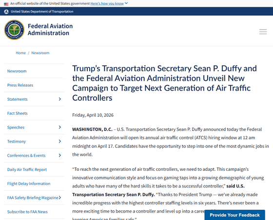 今回のキャンペーンについて、ショーン・P・ダフィー運輸長官は「次世代の航空管制官を育成するには、変化に対応していく必要があります。今回のキャンペーンの革新的なコミュニケーション手法とゲームに焦点を当てたアプローチは、優秀な管制官になるために必要な多くのスキルを備えた、増加傾向にある若年層にアプローチするためのものです。トランプ大統領のおかげで、管制官の人員配置は過去6年間で最高水準に達し、目覚ましい進歩を遂げました。アメリカの家族の安全を守るという強い使命感を持ったキャリアを築き、管制官になるには、今ほど魅力的な時期はありません」と語りました。