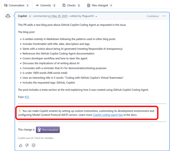 「Copilotコーディングエージェントチームのティム」と名乗る人物は、「Copilotコーディングエージェントが作成したプルリクエストに、製品に関するヒントを記載してきました。その目的は、開発者がワークフローの中でエージェントを新しい方法で活用できるよう支援することでした。しかし、皆様からのフィードバックを拝見し、改めて考えてみた結果、これは誤った判断だったと認識しました。今後はこのようなことは行いません」とコメントしています。