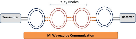 そこで過去の研究では、MI無線通信の基本構造を発展させて、複数のコイルを中継のように配置することで信号をリレー形式で伝えるMIウェーブガイド(導波路)手法を提案しています。MIウェーブガイドでは伝送パス損失を大幅に減らしながら通信範囲を拡大できるとのこと。