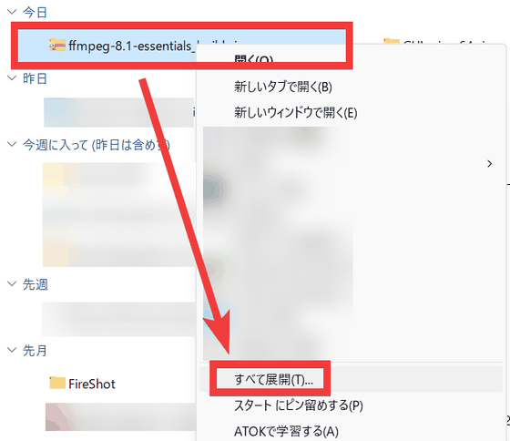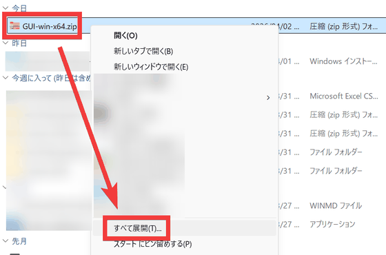 ダウンロードしたZIPファイルを右クリックし「すべて展開」を選択。