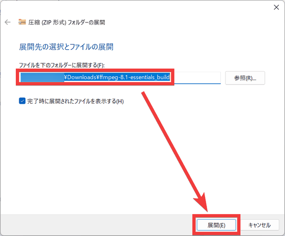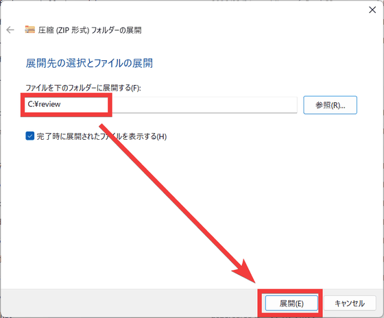 解凍先のフォルダを指定して「展開」をクリックします。