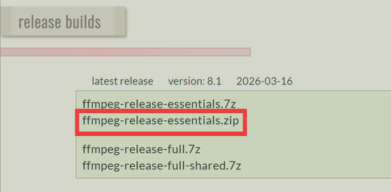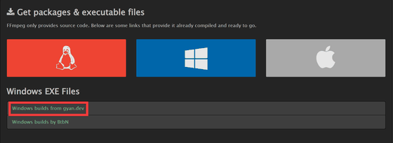 Download FFmpegからFFmpegをダウンロードするためダウンロードサイトへのリンクをクリック。