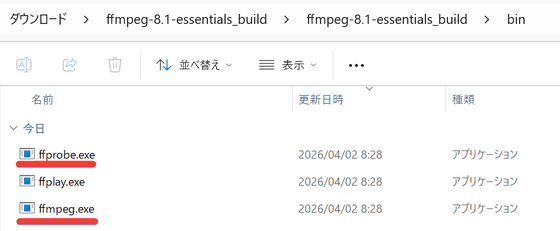 解凍先のフォルダを開き「ffprobe.exe」と「ffmpeg.exe」をVideo Duplicate Finderを解凍したフォルダにコピー。