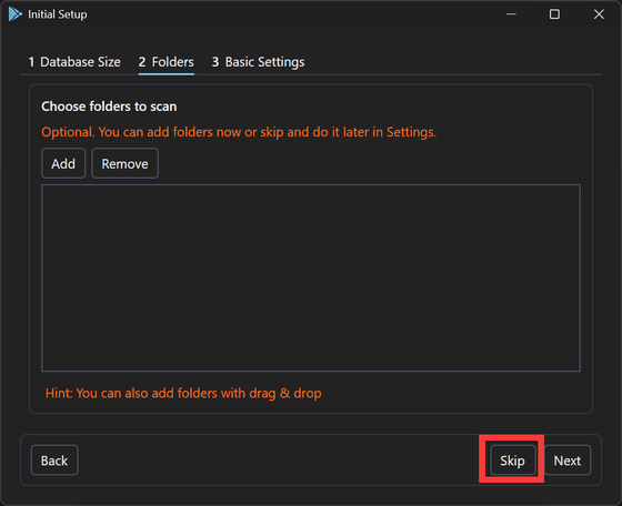 スキャンするフォルダを登録する画面が表示されますが、いったん「Skip」をクリック。