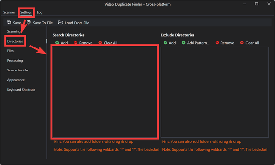 GUI版のVideo Duplicate Finderを利用する場合、メイン画面から「Settings」から「Directories」をクリックし、スキャンするフォルダを「Add」ボタンもしくはドラッグ&ドロップで指定します。