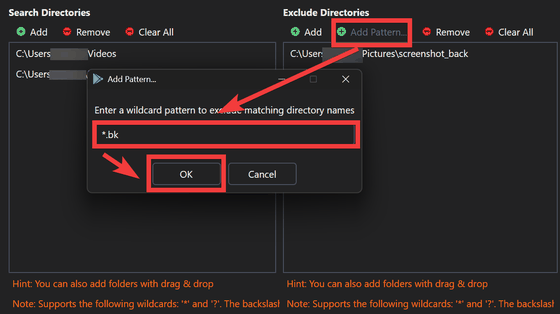 除外するフォルダを登録することもできます。ファイル名やフォルダ名のパターンで除外したい場合は、「Add Pattern」をクリックし、「*.bk」など除外したいパターンを入力して「OK」をクリック。