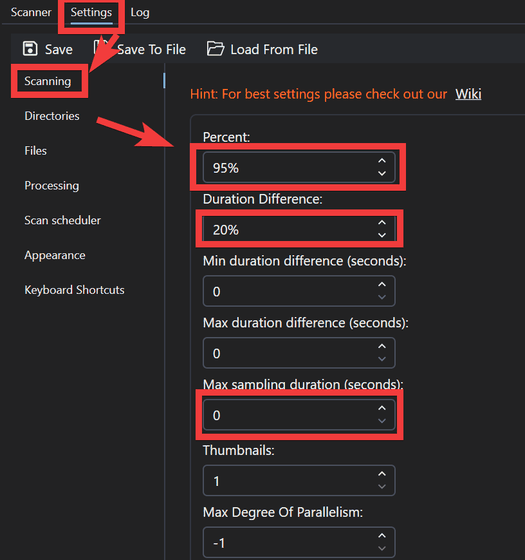 重複かどうかの判定基準を設定するには「Setting」から「Scanning」をクリックし、各種パラメータを設定します。大きく3つの設定項目が重複判定の基準として影響します。