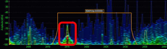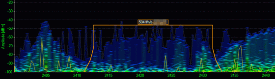 In the graph, the vertical axis is the strength of the radio wave, the horizontal axis is the frequency, the orange line is the area of the channel to which the mobile router's radio wave corresponds, and the stronger the color, the stronger the radio wave is emitted . At 3840x2160 resolution, the channel area of the mobile router is not particularly responsive.