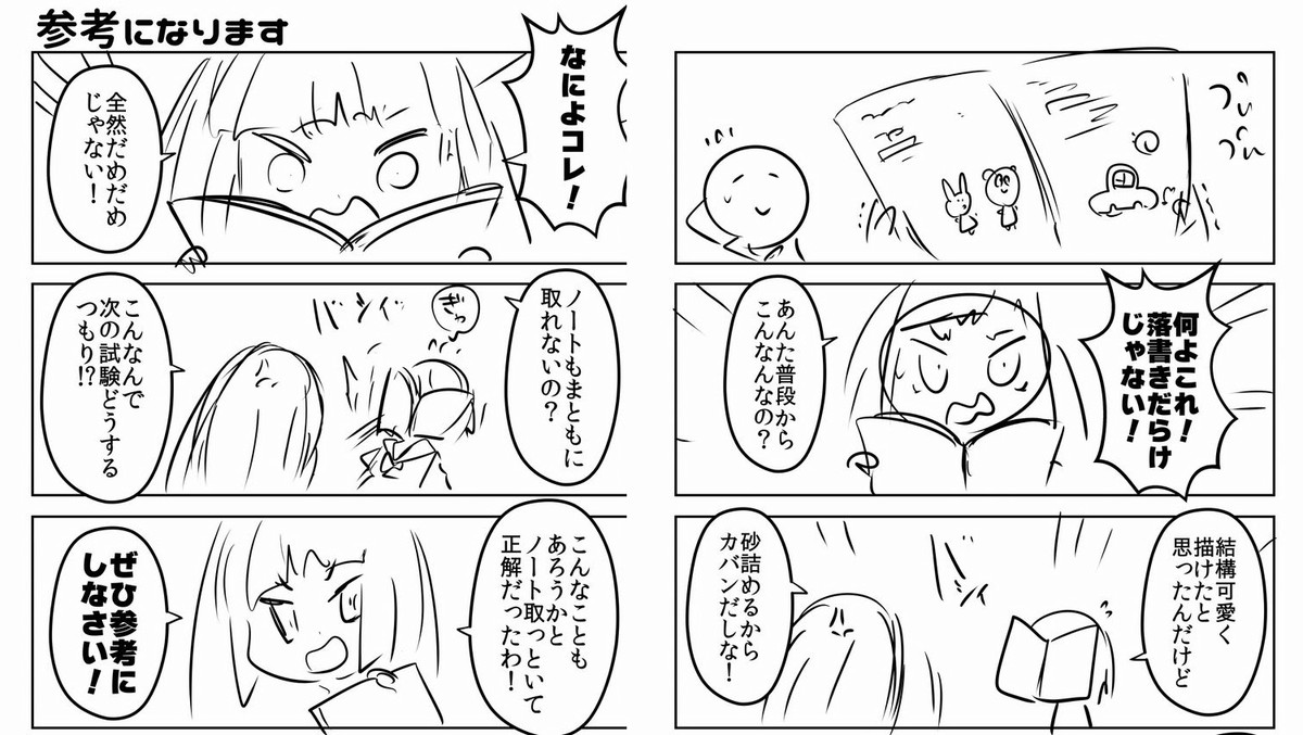 Also, the door part has changed from the initial plan. On the left, it is a picture that can be understood as an episode to study, which is also interesting, but on the right, it is a picture that carries out the 'penalty with sand on the bag' in the upper frame regardless of study. When 'blurring' in manga, it is difficult to convey the fun with just the text, so it is an important idea to add an image picture to make the picture interesting.