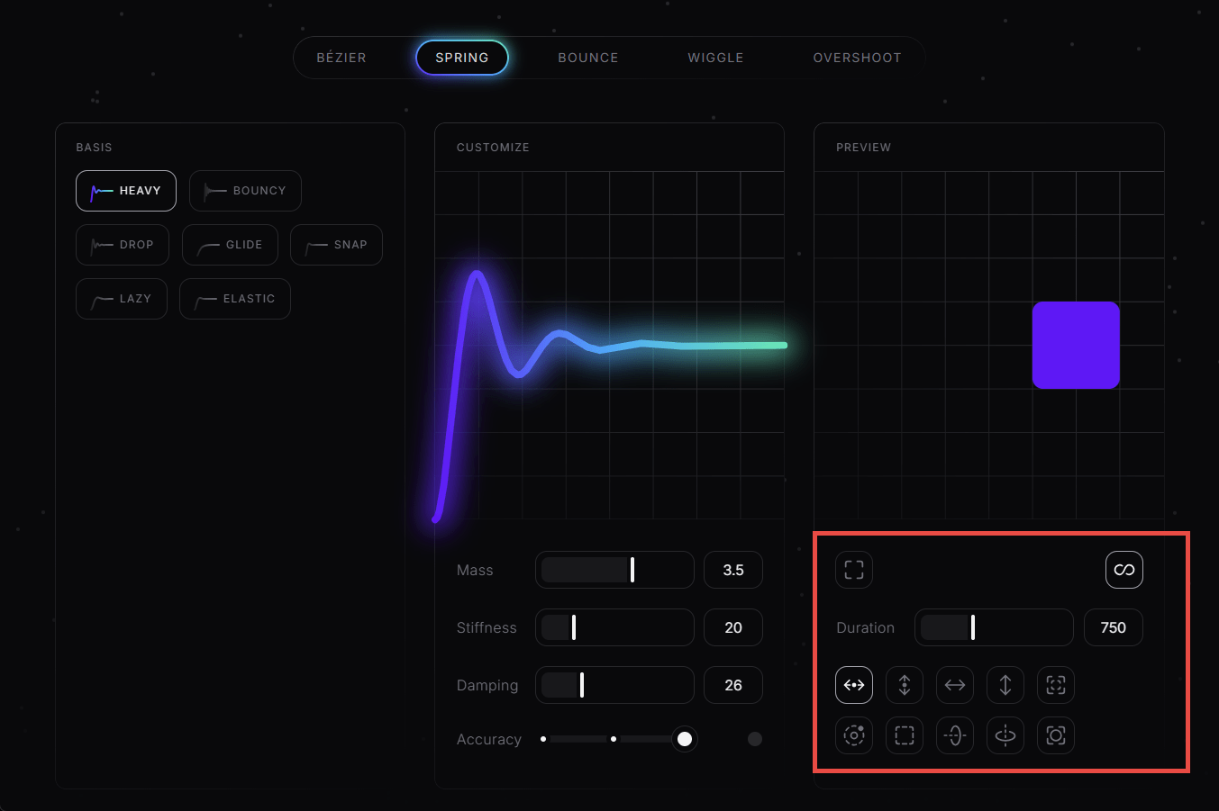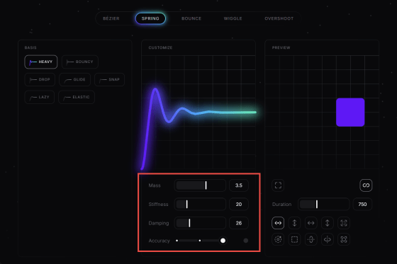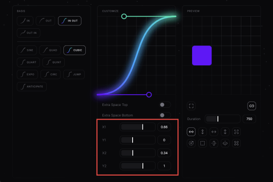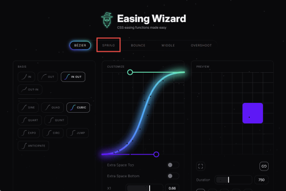 Looking at animations other than 'SPRING,' one that is particularly interesting is 'BÉZIER.' The cubic-bezier() function defines