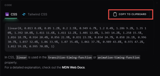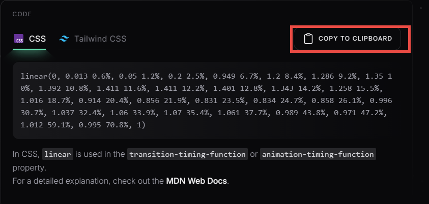 Scrolling further down reveals the easing function code that creates the animation. You can choose between CSS and