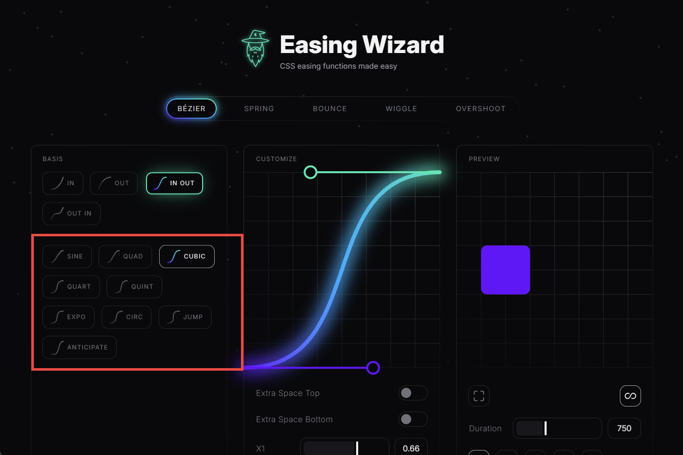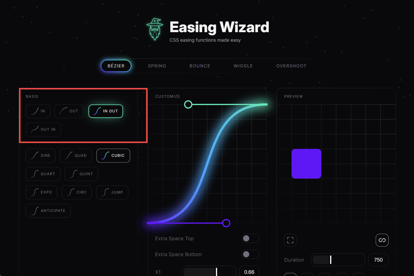 So we will use the Easing Wizard again. When you select 'BÉZIER' from the animation type, the BASIS will be one of the following four options.