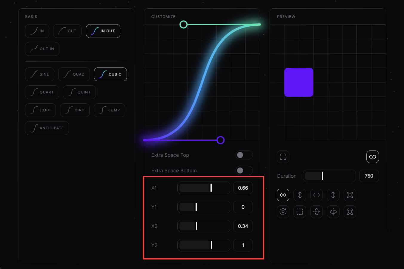Customizing BÉZIER is different from other methods in that you specify the coordinates of the intermediate points, as explained below in the cubic-bezier() function.