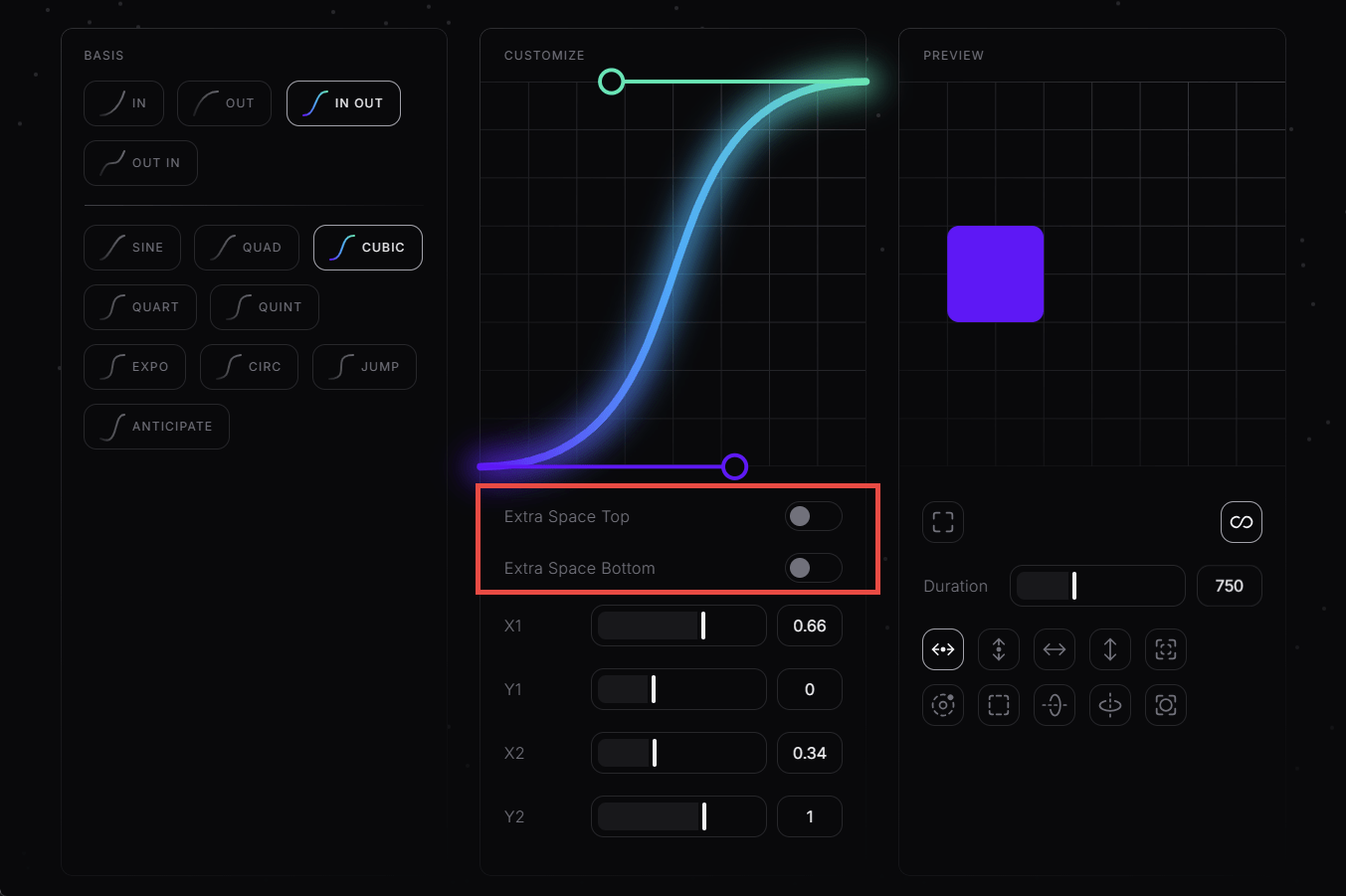 If you scroll down a bit, you'll see controls in the middle for customizing the animation behavior. The available adjustments are: