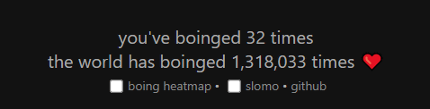 At the bottom of the screen, you can see how many times you've bounced the ball and the total number of times the ball has bounced around the world. Clicking 'boing heatmap' displays a heatmap, and clicking 'slomo' displays the ball's movement in slow motion.