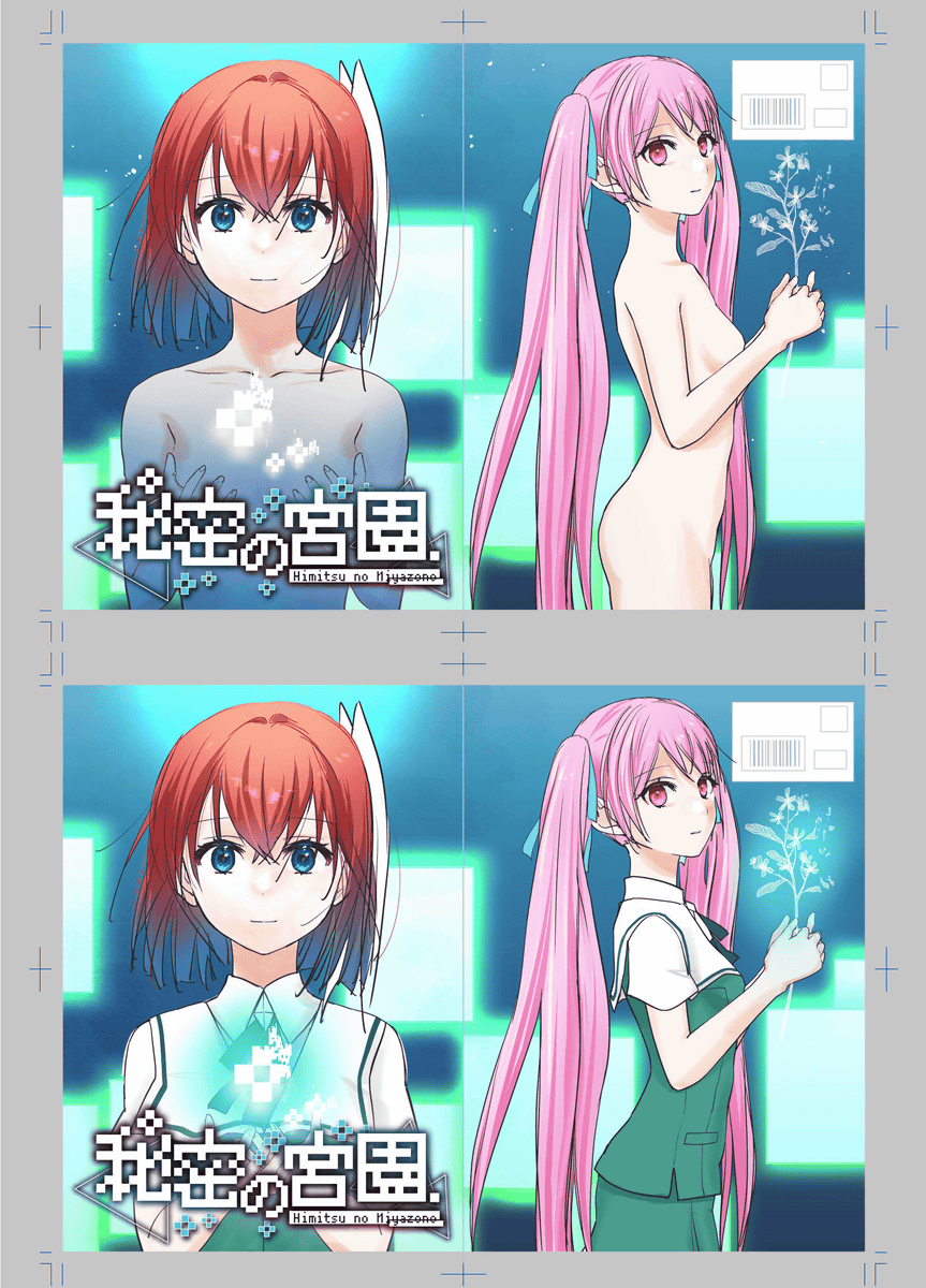 As cover designs for the 'Himitsu no Miyazono' comic, the original author, Sukoyaka, has come up with several designs. Below is a design featuring the two main characters, Rinne on the front cover and Kanon on the back cover.