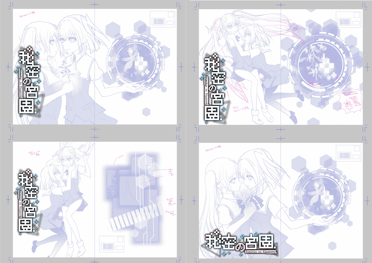 The following is a proposal to move Kanon and Rinne to the cover, with a sci-fi-style pattern on the back cover that conveys the atmosphere of the work. The cover design that was selected has already been decided, and the final draft is underway, so please look forward to the release.