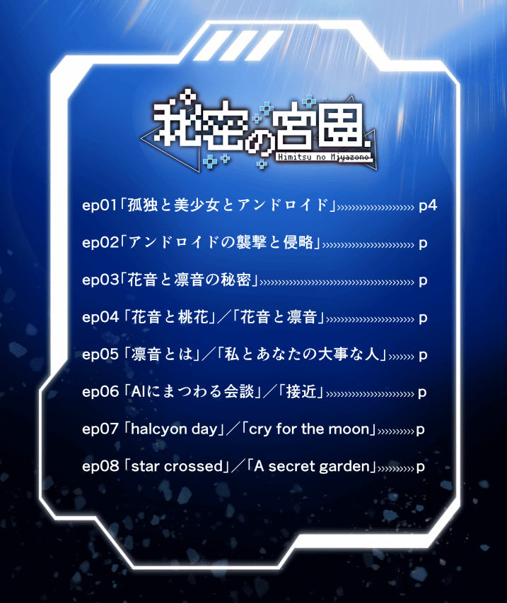 Below is the table of contents design currently being created for the 'Himitsu no Miyazono' comic. This design, also by the original author Sukoyaka, features a cyber-inspired color scheme and a design that resembles light piercing from the deep sea.