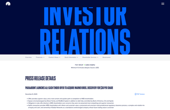 In return, Paramount Skydance will pay $30 (approximately 4,670 yen) in cash for each WBD share and aim to acquire all of WBD's businesses, including the Global Networks business, which is scheduled to be separated.