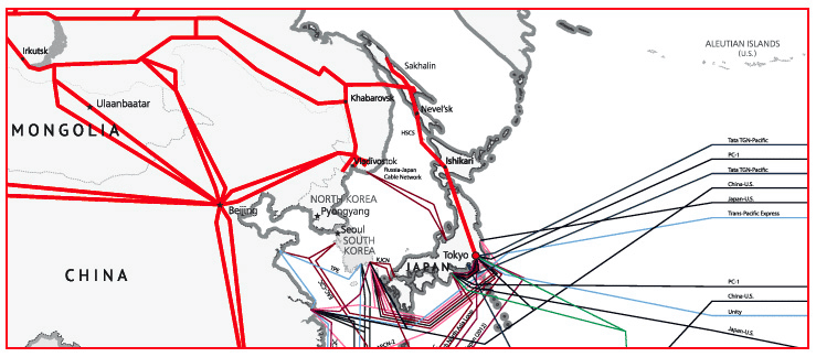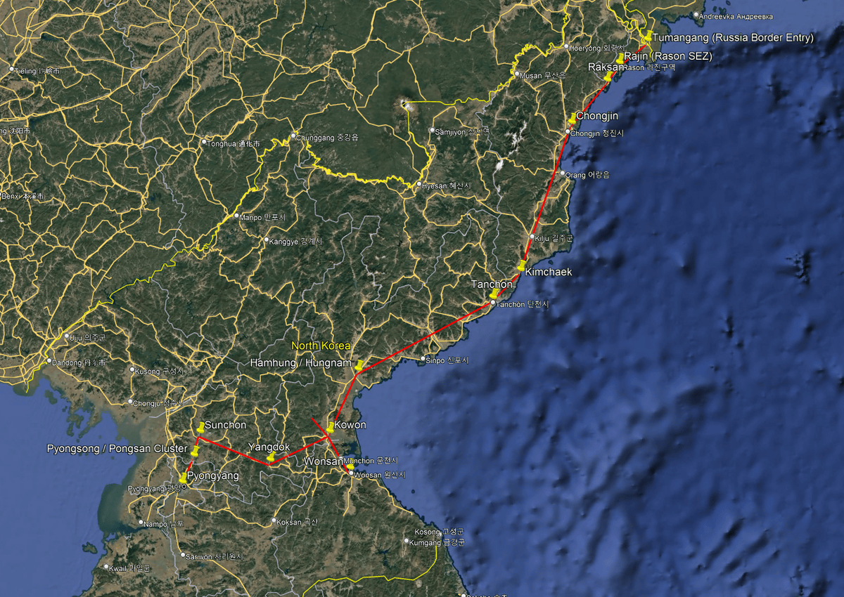 Based on this information, Nick predicts that the fiber optic cable from Russia crosses the Tumen River into North Korea, then connects to Pyongyang via the east coast (on the Sea of Japan side). He plots the location on a map.