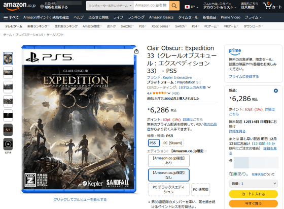 Clair Obscur: Expedition 33 (Sandfall Interactive/Kepler Interactive) is available for PlayStation 5, Xbox Series X|S, and PC. The physical version for PlayStation 5 is available on Amazon.co.jp for 6,286 yen (tax included).