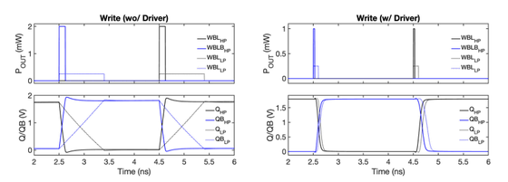 The following is a simulated waveform demonstrating how data in pSRAM can be accurately rewritten using an optical signal. The top graph shows the 'light pulse input' required for writing, while the bottom graph shows how the stored data (voltage Q/QB) flips from '0' to '1' or '1' to '0' upon receiving that light. The graph on the right shows that by combining the drive circuit, data can be successfully rewritten in just 25 picoseconds.