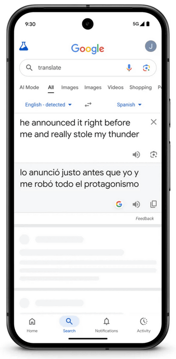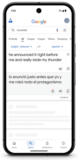 For example, the phrase 'stealing my thunder' would previously be translated word for word as 'stealing my thunder,' but now it will be translated as an idiomatic phrase as 'stole my credit.' This is because Gemini will correctly determine that this is an idiomatic phrase by analyzing the context, making it easier to get a more natural and accurate translation.