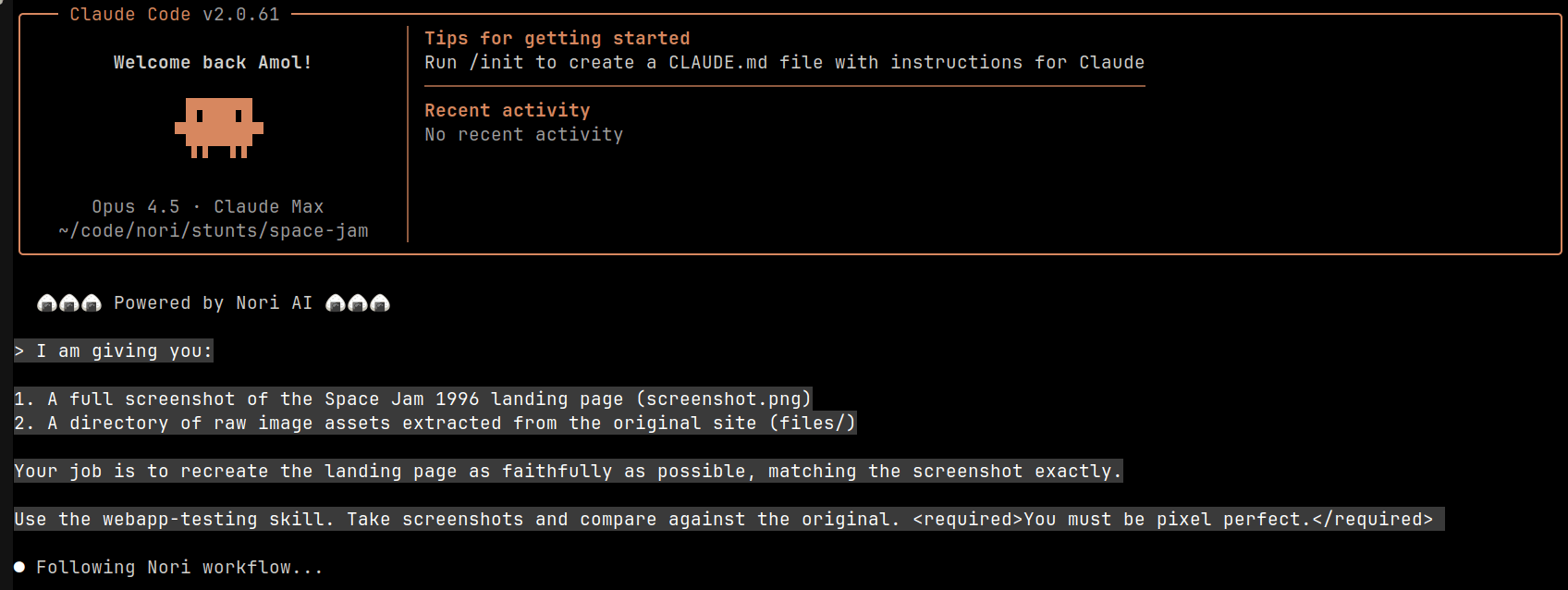 Theahura used Claude Code (Opus 4.1) and nori , and planned to generate a static HTML page with CSS alignment, a tiled star background, and a footer using tests from the webapp-testing skill. He created a Playwright test to compare the recreated website pixel-by-pixel with the original screenshot to confirm its fidelity.