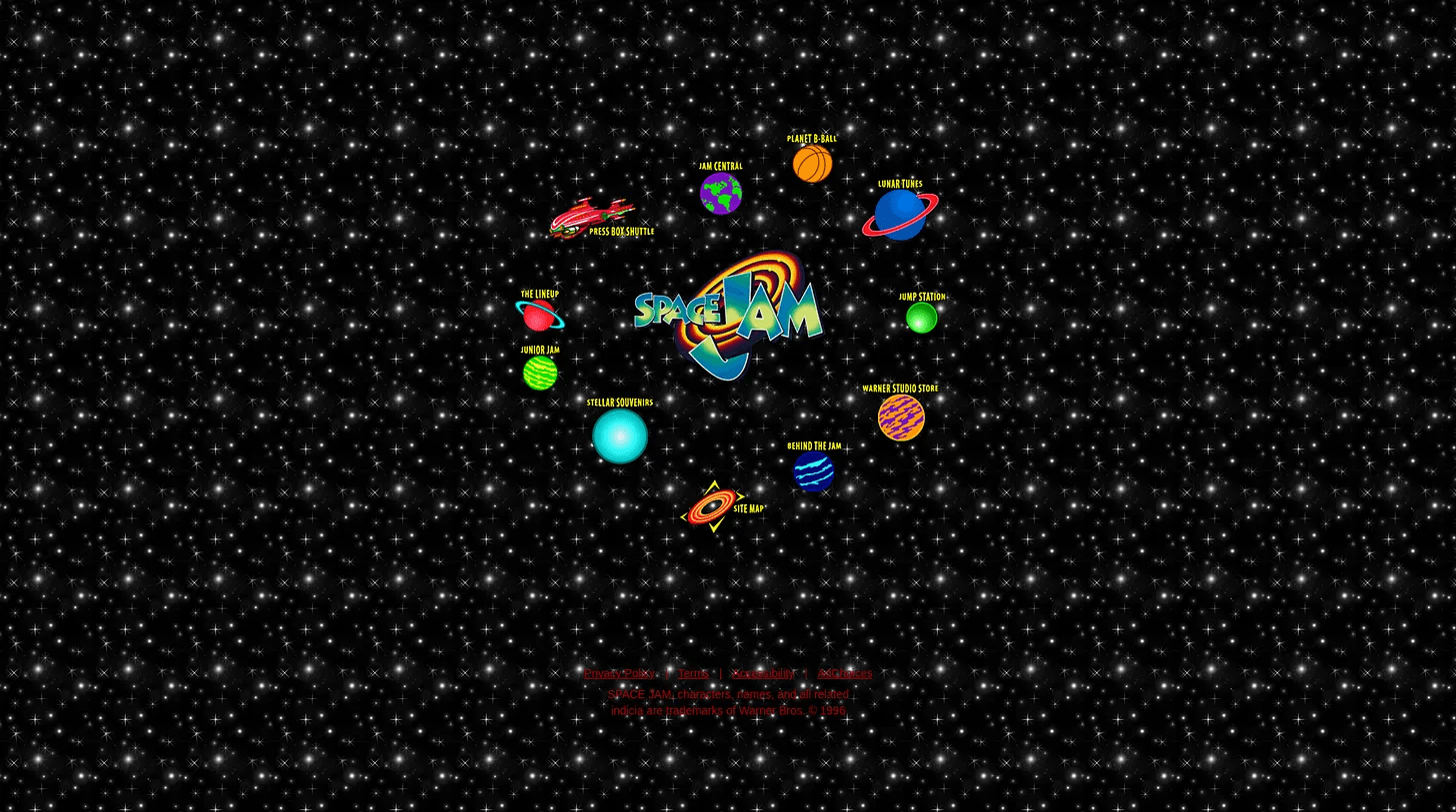 1. A full screenshot of the Space Jam 1996 landing page.