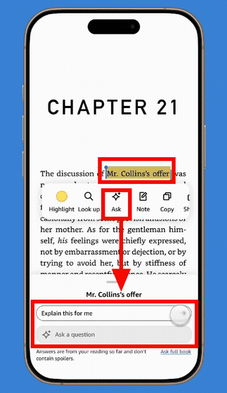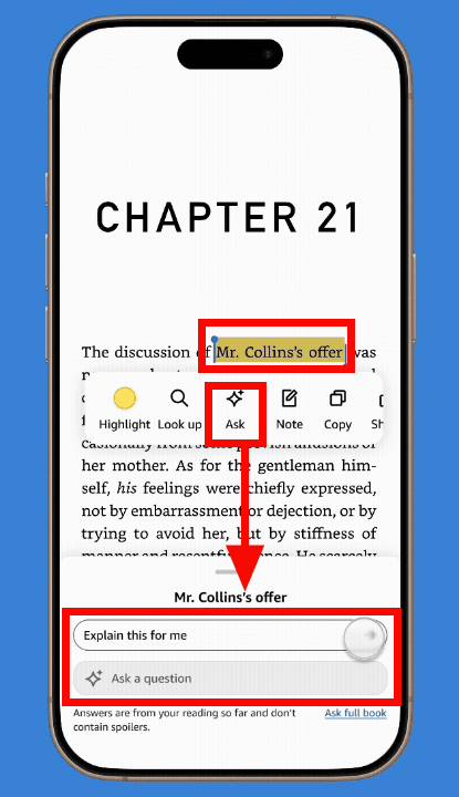 To use Ask this Book, tap and hold any text in the book you're reading to select it, choose 'Ask this Book,' and tap a suggested question or type your own.