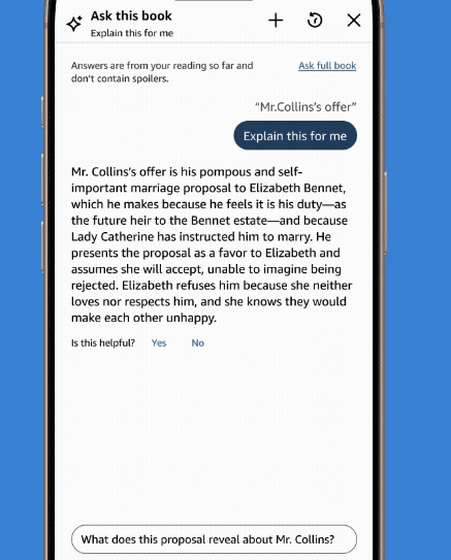 Amazon has announced a new feature for its Kindle smartphone app called ' Ask this Book ,' an AI assistant that asks questions about the book you're reading and responds with information about the plot, characters, and other relevant details. It only displays information up to the point you've read, so you can ask questions without spoilers.