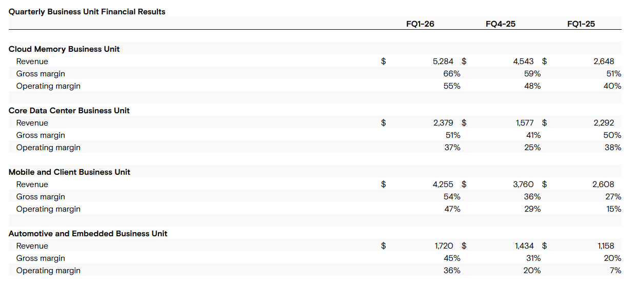 The breakdown by business segment is as follows: Cloud Memory Business Unit revenue was $5.284 billion (approximately 8.2 trillion yen), approximately double the figure for the same period last year.