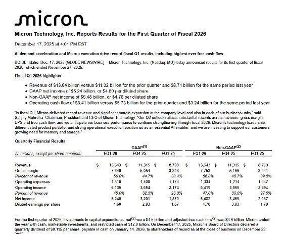 Micron's revenue for the first quarter of fiscal year 2026 was $13.643 billion (approximately ¥2.1 trillion), up 56% from the same period last year. GAAP net income was $5.24 billion (approximately ¥820 billion), up 180% from the same period last year.
