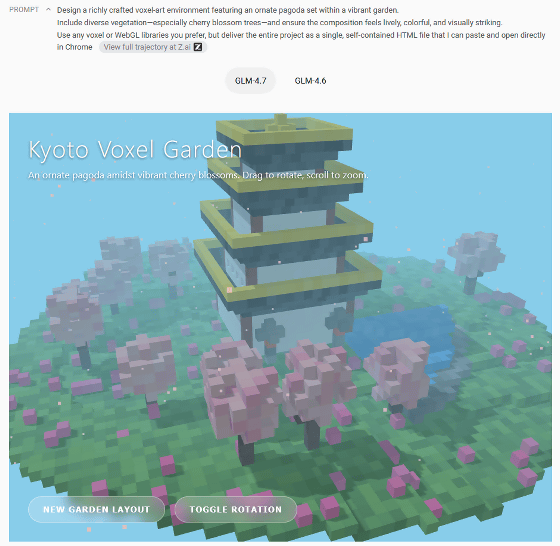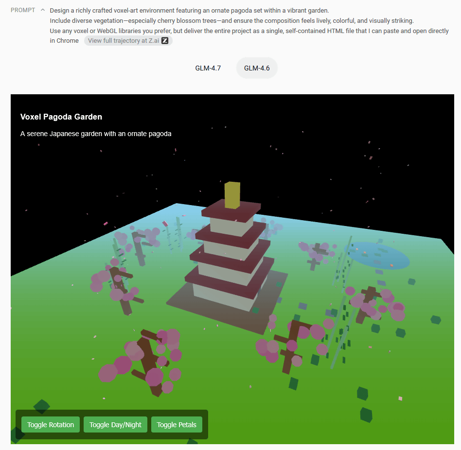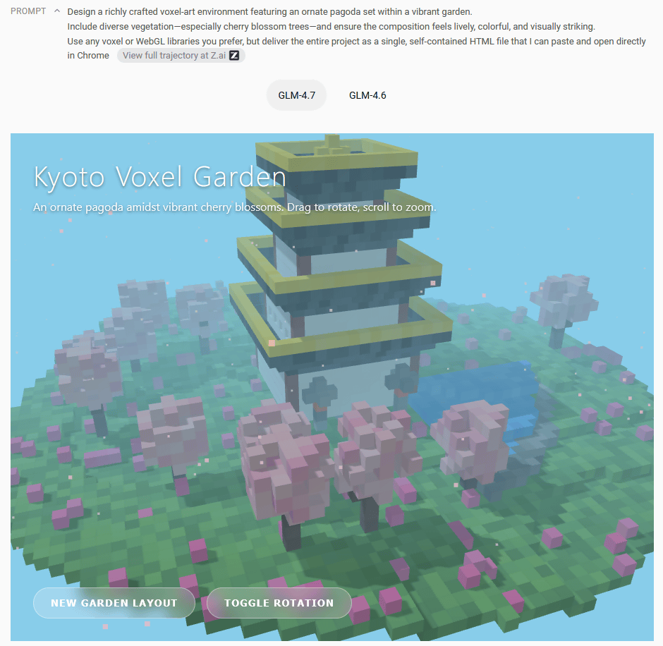 GLM-4.7 has achieved significant performance improvements over its predecessor, GLM-4.6, and has also improved the UI quality of generated web pages, etc. Below is the result of entering the prompt 'Draw a voxel art including a garden with prominent cherry blossoms and a pagoda in a single HTML file' into the previous generation, GLM-4.6.