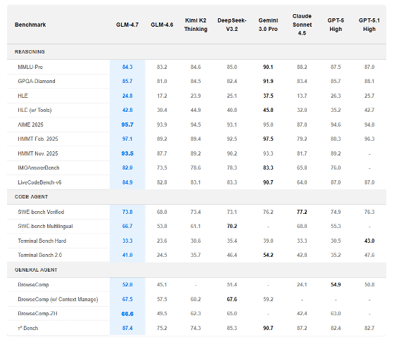 The various benchmark scores for 'GLM-4.7', 'GLM-4.6', 'Kimi K2 Thinking', 'DeepSeek-V3.2', 'Gemini 3.0 Pro', 'Claude Sonnet 4.5', 'GPT-5 (High)', and 'GPT-5.1 (High)' are as follows. GLM-4.7 outperformed Gemini 3.0 Pro in tests such as AIME 2025 and HMMT Nov. 2025.