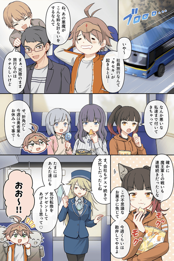 The bonus manga, drawn specifically for the comic, follows Kuzuru and his friends, who work at a game company where they're so confined that they can't even go home from work, as they all go on an overnight 'company trip.' A defining feature of 'The Dual Life of a Hero and Corporate Slave' is the struggles they face with their colleagues in two different worlds: 'Hero in Another World' and 'Corporate Slave in Japan.' As this is a special episode, even though it's a company trip in Japan, the hero's party members are dressed in cute casual clothes.
