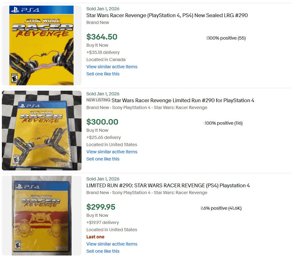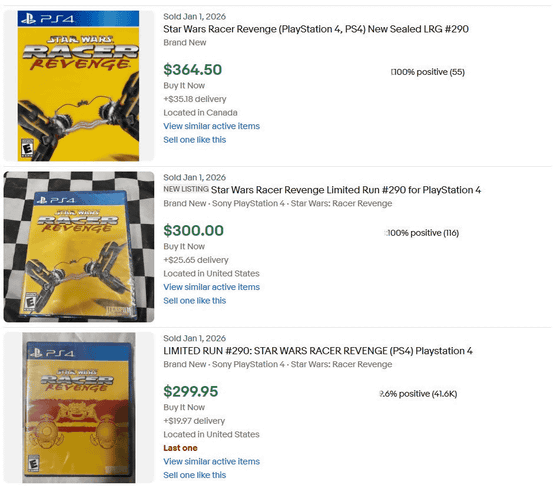 'Star Wars: Racer Revenge' is a game released for the PS2 in 2002. The PS4 port has only 9,500 copies in total distributed worldwide, with approximately 1,000 limited editions and approximately 8,500 regular editions, making it an extremely rare title. Therefore, the only way to obtain 'Star Wars: Racer Revenge' is to bid on an online auction site such as eBay or search through second-hand shops. Used copies were trading for around $20 (approximately 3,100 yen), but due to Gezine's point, at the time of writing, the price had already risen to nearly $400 (approximately 62,000 yen).