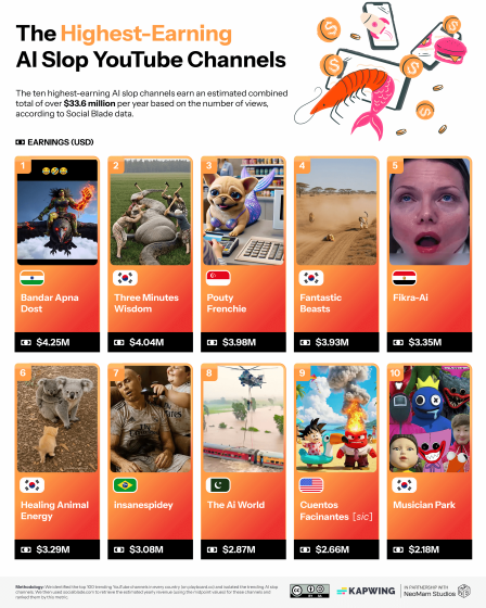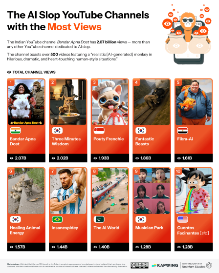 Kapwing also compiled the top 10 'Most Viewed AI Slop Channels in the World.'