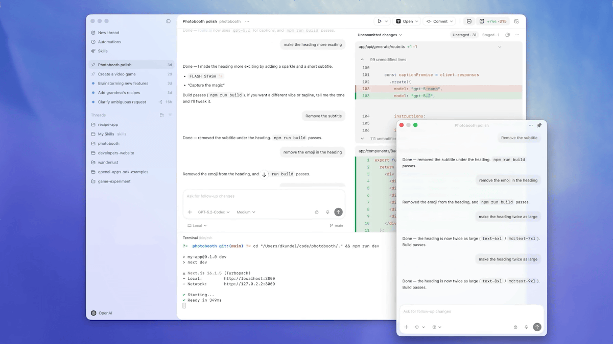 OpenAI has released the Codex app , a desktop app for agent-driven development. The Codex app features multitasking and code diffing, and can also perform various tasks using Skills.