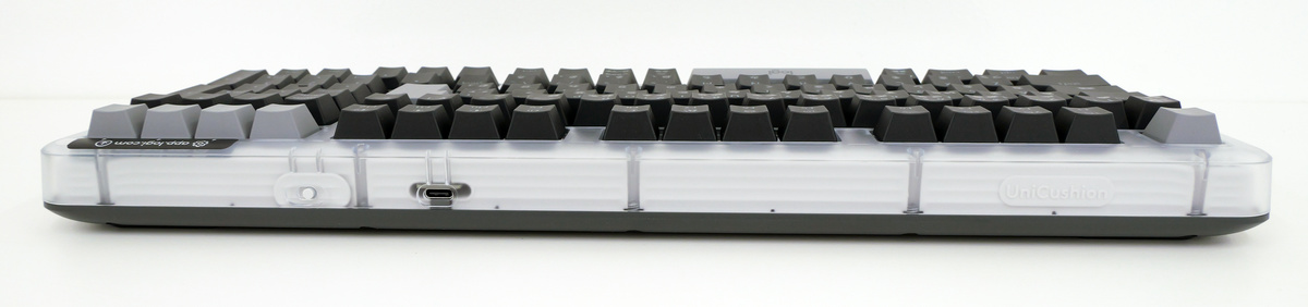 The top panel houses the Bluetooth switch and USB-C port. The white part visible through the transparent body is the gasket mount 'UniCushion.' Gasket mounts tend to wear out over time, but the K98M's UniCushion is quite thick, providing excellent shock absorption and long-lasting durability.