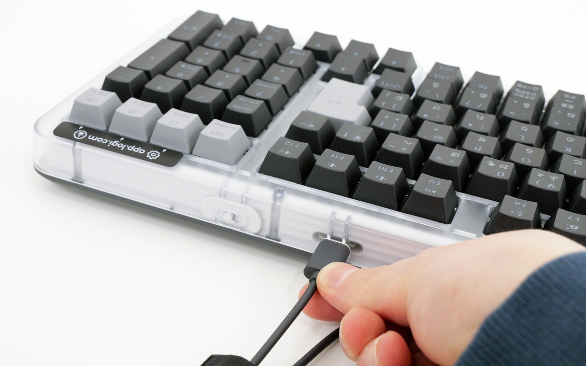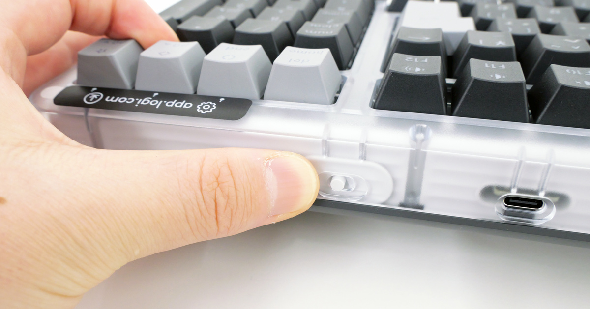 Now let's actually connect it to a PC and use it. There are two ways to connect the K98M to a PC: using Bluetooth or using the Logi Bolt USB receiver. First, to connect via Bluetooth, turn on the Bluetooth switch on the top panel.