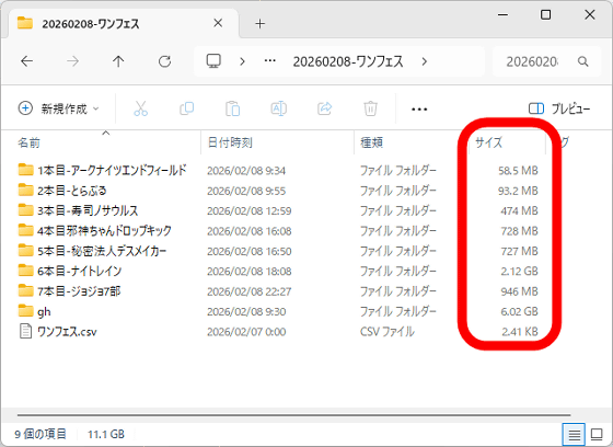 The detailed view in Explorer is shown below. The file size is displayed, but the folder size is not.