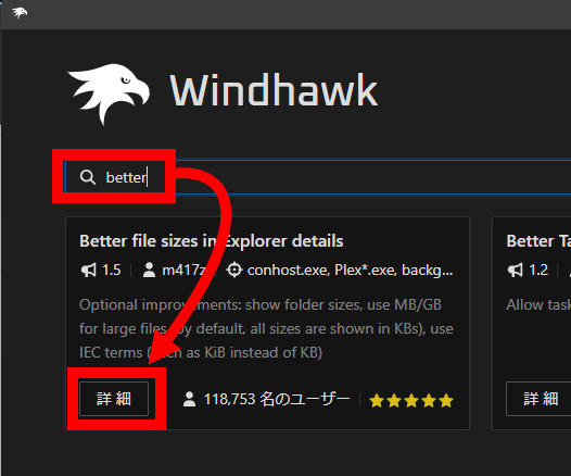 Enter 'better' or something similar in the search bar, search for the mod 'Better file sizes in Explorer details,' and then click 'Details.'