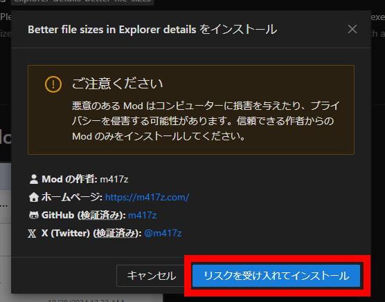 A warning about the risks of the mod will appear, so click 'Accept the risk and install.'