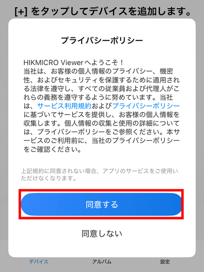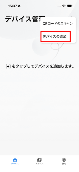 No user registration is required to use HIKMICRO Viewer. The app has a simple UI with only three sections at the bottom: 'Devices,' 'Albums,' and 'Settings.' Tap the '+' in the top right corner of 'Devices.'